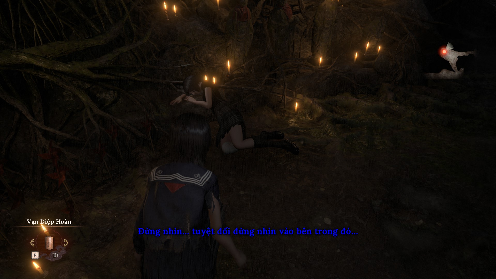 Người chơi có thể nắm tay Mayu để hồi phục và tăng sự gắn kết giữa hai chị em trong hành trình sinh tồn. -