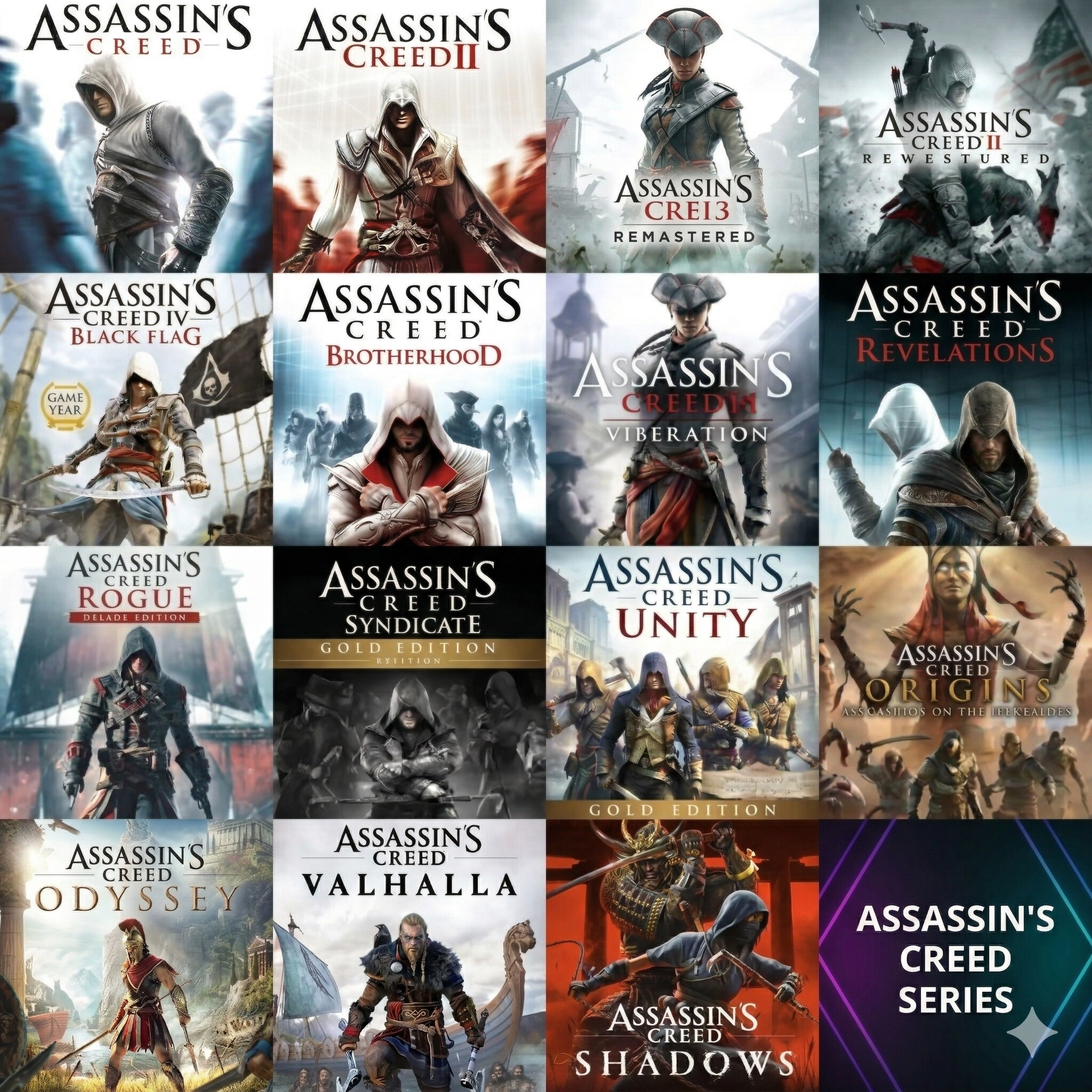Assassin’s Creed Collection là bộ sưu tập gồm 16 tựa game nổi bật nhất trong series Assassin’s Creed của Ubisoft, đưa người chơi khám phá nhiều giai đoạn lịch sử khác nhau – từ thời Trung Cổ, Phục Hưng, Cách mạng công nghiệp cho đến thế giới cổ đại.